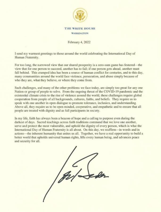 وقال: "تقدر اللجنة العليا للأخوة الإنسانية مشاركة الرئيس بايدن والقادة الآخرين بمناسبة هذا اليوم الذي يمثل لحظة فارقة في تاريخ الإنسانية، والذي اجتمع فيه قائدا أكبر مؤسستين في العالمين المسيحي والإسلامي عام 2019 للتوقيع على وثيقة الأخوة الإنسانية في أبوظبي ..أجدد امتناني لقيادة دولة الإمارات العربية المتحدة لدعمها مسيرة الأخوة الإنسانية منذ انطلاقتها الأولى".