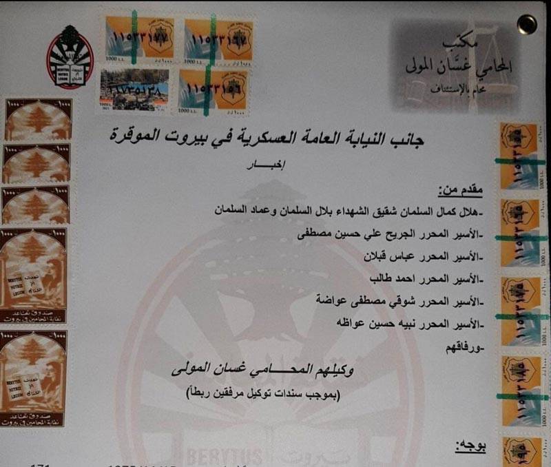 تقدم المحامي غسان المولى بوكالته عن هيئة ممثلي الأسرى والمحررين بإخبار أمام النيابة العامة العسكرية في بيروت ضدّ أكثر من 100 عميل بالاسم والهوية ومكان الاقامة.