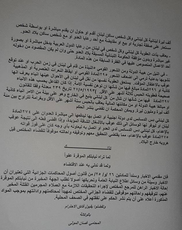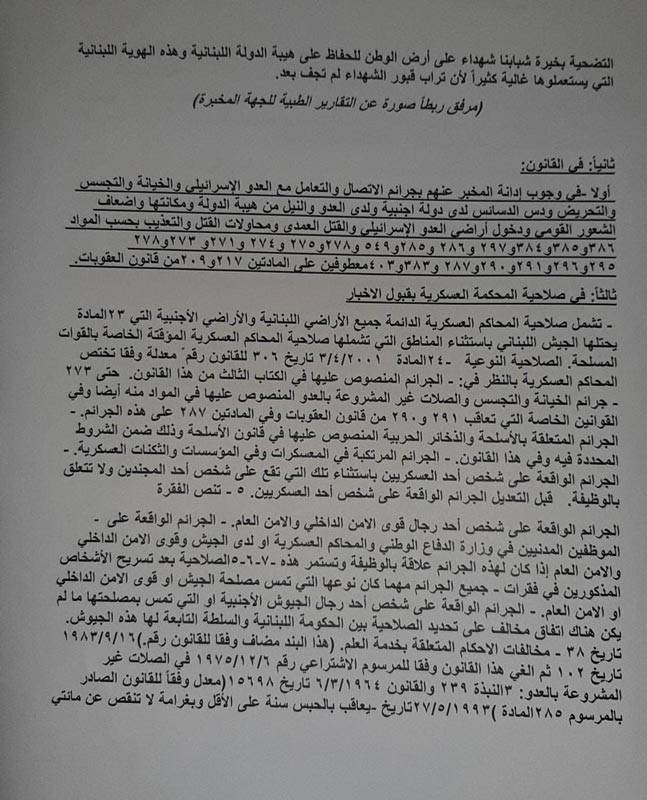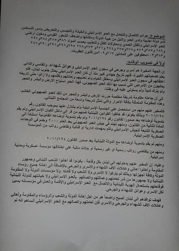 إخبار أمام النيابة العامة العسكرية في بيروت ضد أكثر من 100 عميل بالاسم والهوية