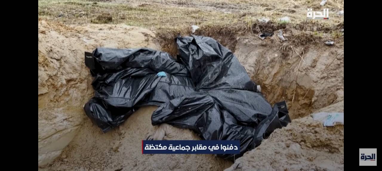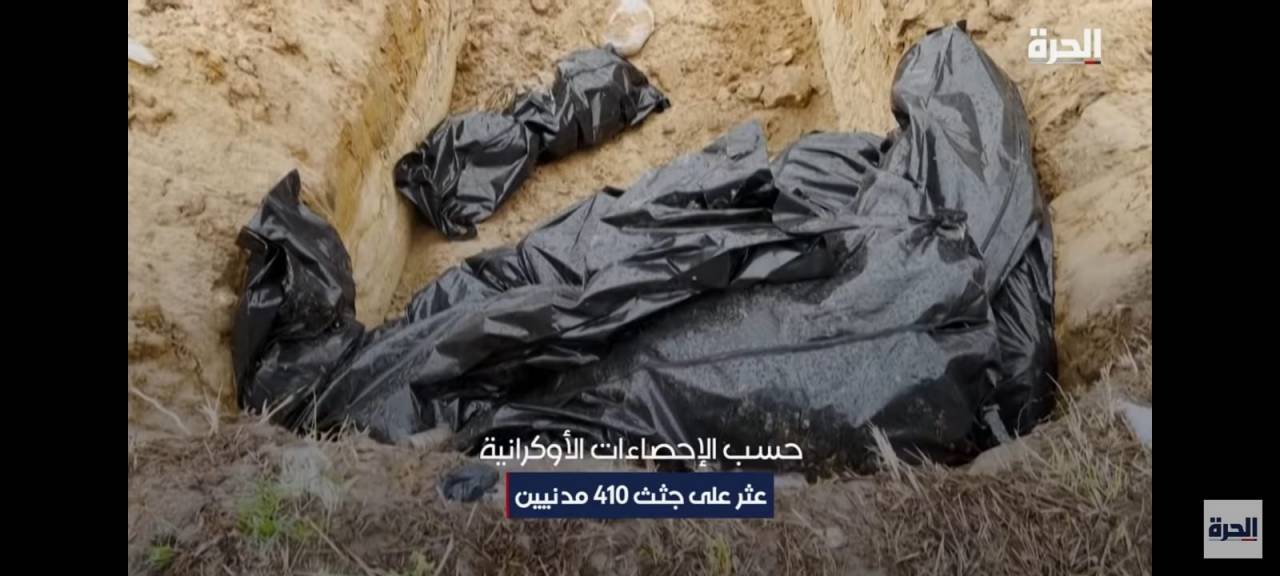 من الواضح ان المخابرات الغربية قامت بتزويد الإعلام الغربي المتواطى معها والببغاوي في ترديد ما هو مطلوب منها على الشاشات الفضائية بما يثبت ان القبر تم العثور عليه مكشوف وفيه تم العثور على عدد من الجثامين...والتي كما شاهدناها كانت بالاكياس الحافظة...ولو فرضنا ان القبر كان مغطى بالتراب فأين صور الحفارات الاوكرانية والجنود الاوكرانيين بادوات الحفر على جانب وبجوار القبر في ما تم كشفه داخل القبر كنا يحدث في مثل هذا الاكتشاف الهام...ولكن كل ما تم تزويد العالم به هو صور لقبر مكشوف وبه عدد محدد جدا الأكياس السوداء يزعم أنها تحتوي على جثامين قتلى.