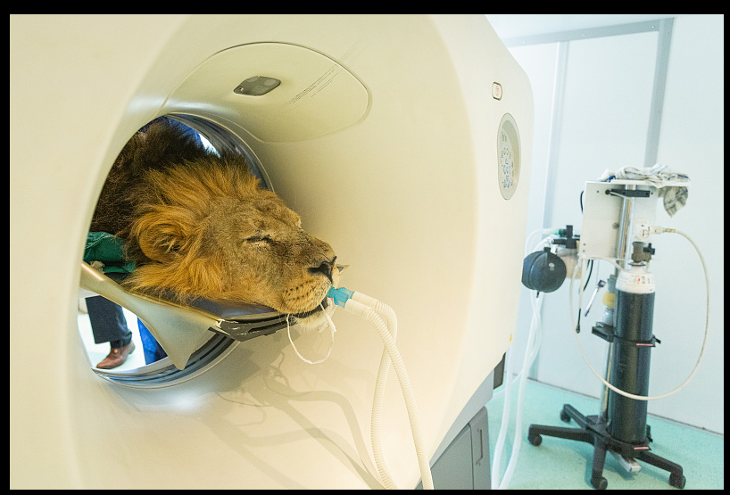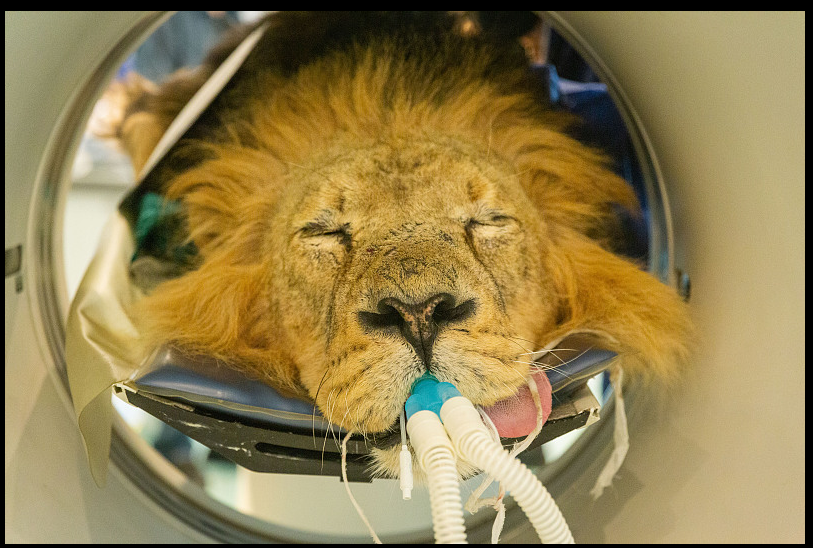 والجدير ذكره أنه تم إجراء فحوصات الأشعة المقطعية بعد تخدير الأسد البالغ وزنه (180 كجم)، قبل رفعه إلى الماسح بواسطة 6 أعضاء من الفريق