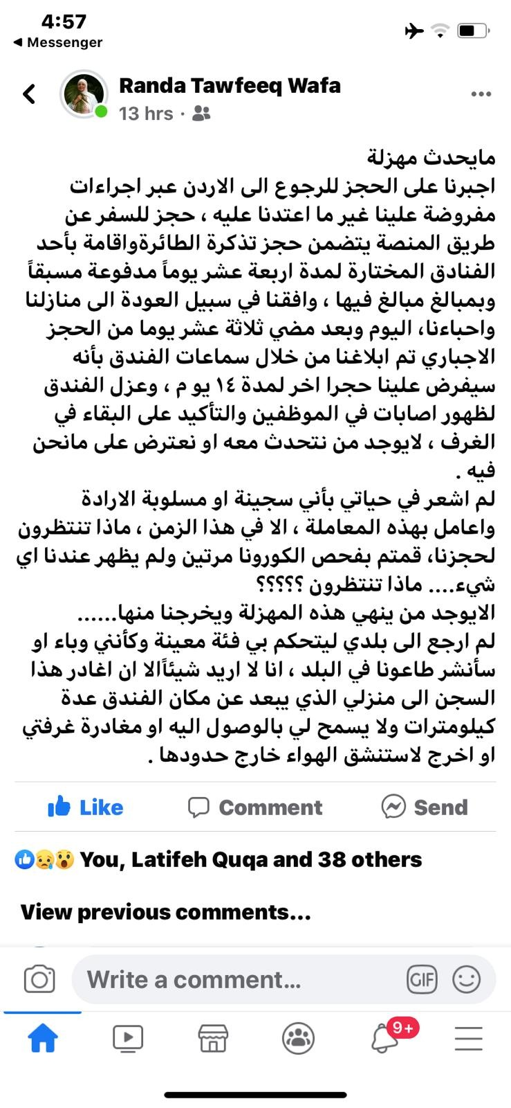 قال رجل الأعمال الأردني المحجور عليه في أحد فنادق البحر الميت زيد دعمس تم حجري في 18/8 لمدة 14 يوما، علما أني كنت قد دفعت كافة رسوم الحجر، وتم فحصنا في أول يوم وصلنا فيه الأردن وقبل يومين من موعد الخروج من الحجر