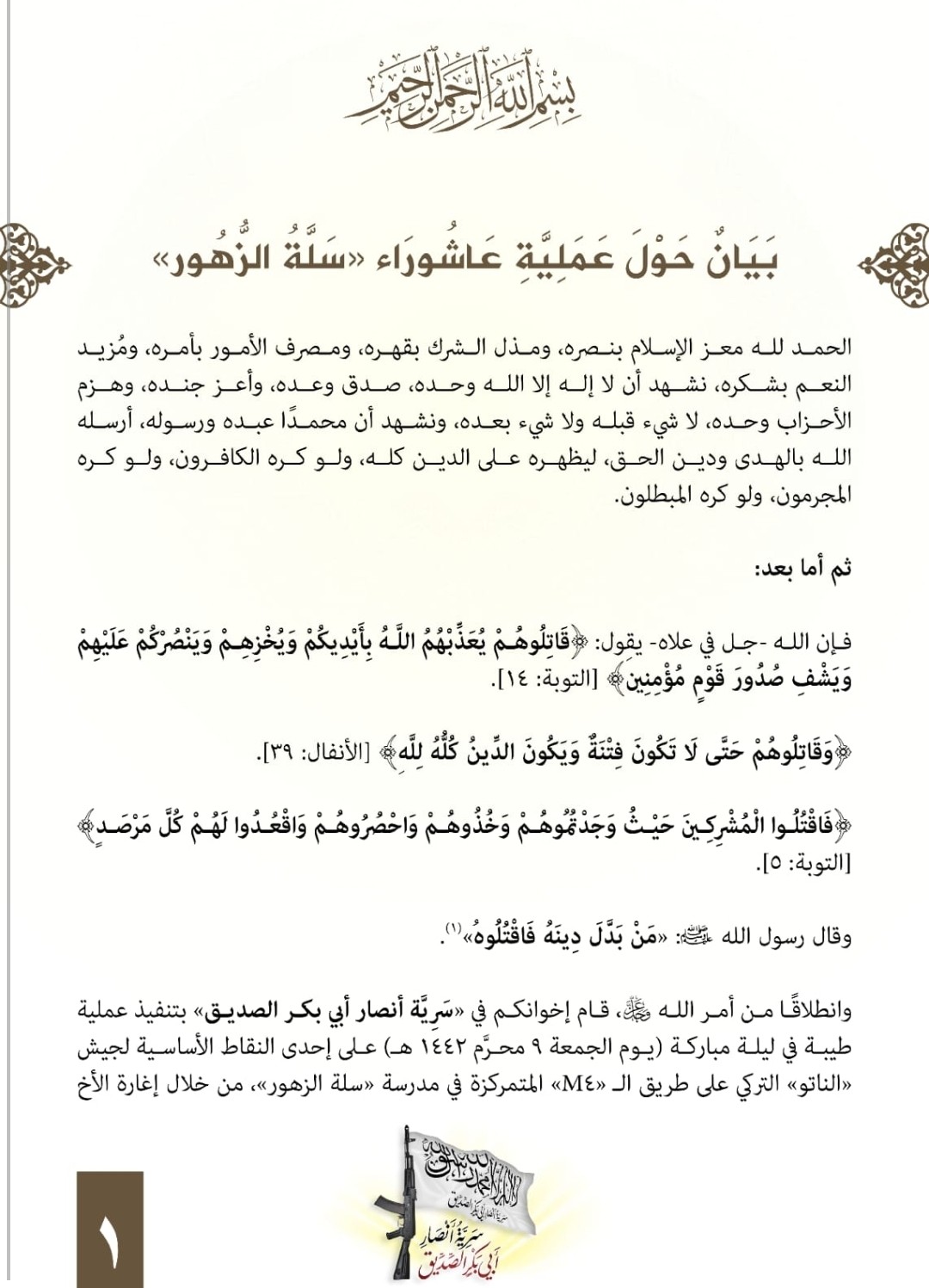 ونشر الفصيل جديد الظهور على الساحة، بياناً أكد خلاله أنّ أحد مسلحيه ويدعى "أبو سليمان الأنصاري" هو من نفذ العملية، نافياً حصول اشتباك مع القوات التركية.