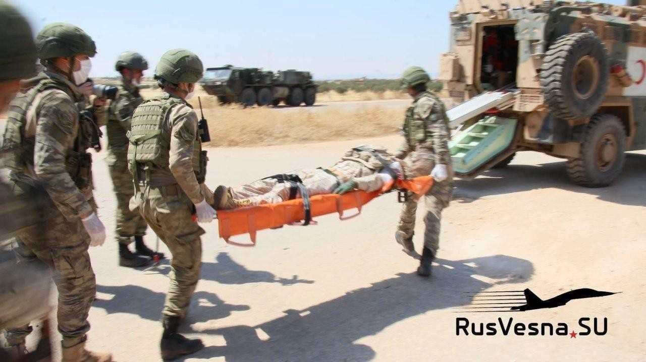وشملت التدريبات أيضاً الإسعاف المباشر للعناصر في حال تعرضوا لإصابات خلال تسيير الدوريات المشتركة، حيث ظهر جنديان تركيان يحملان آخر روسياً بنقالة طبية في إطار التدريب.