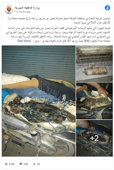 وقالت وزارة الداخلية السورية إن "أفراد شرطة النجدة اشتبهوا بدراجة نارية دون لوحات كانت مركونة على يمين الطريق في حي العسكري أمام معهد القدس التعليمي في المدينة الحسكة، ليكتشفوا أنها مفخخة بتلك الكمية من المادة وكانت معدة للتفجير أثناء تحريك الدراجة".