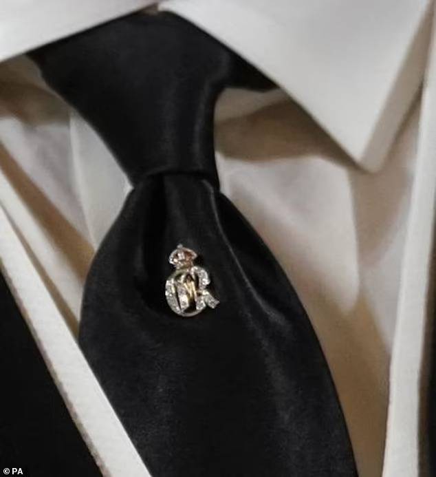 وظهر الملك تشارلز الثالث أثناء تتويجه ملكا ببروش من السيفير على ربطة عنق سوداء يحمل الحرفين "R.C".