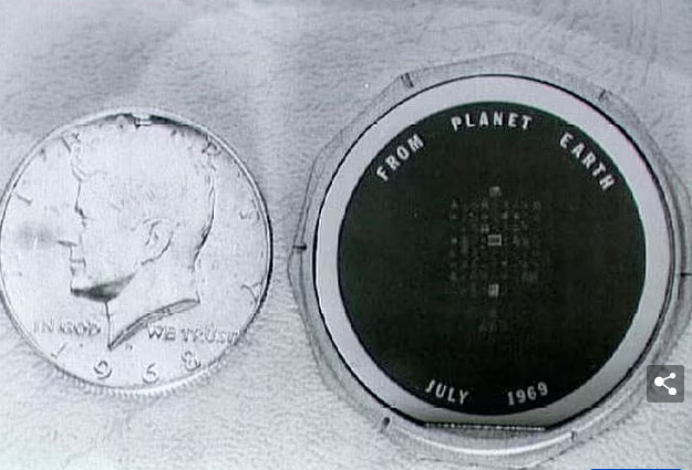 ويوجد في الجزء العلوي من القرص النقش: "رسائل النوايا الحسنة من جميع أنحاء العالم جلبت إلى القمر بواسطة رواد فضاء أبولو 11". وحول الحافة عبارة: "من كوكب الأرض" - يوليو 1969.