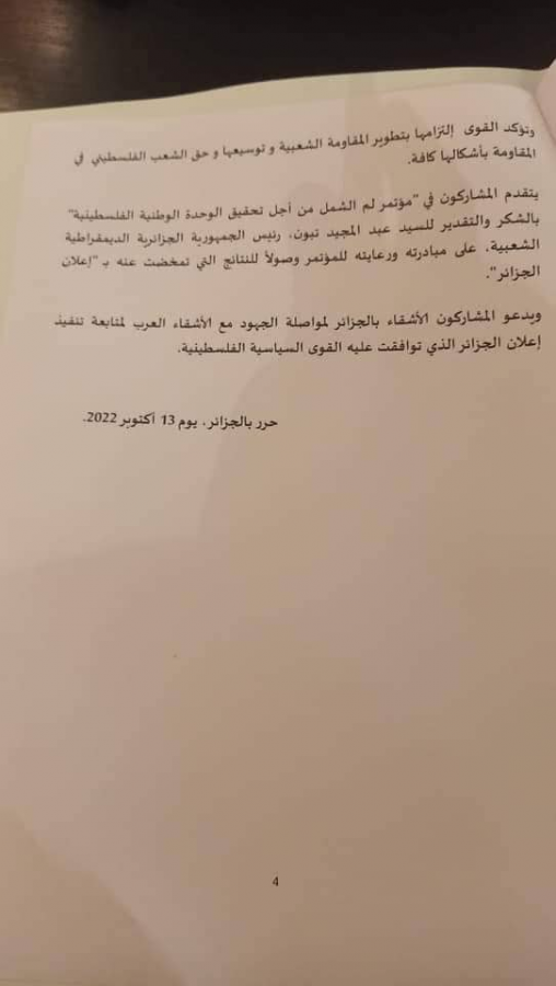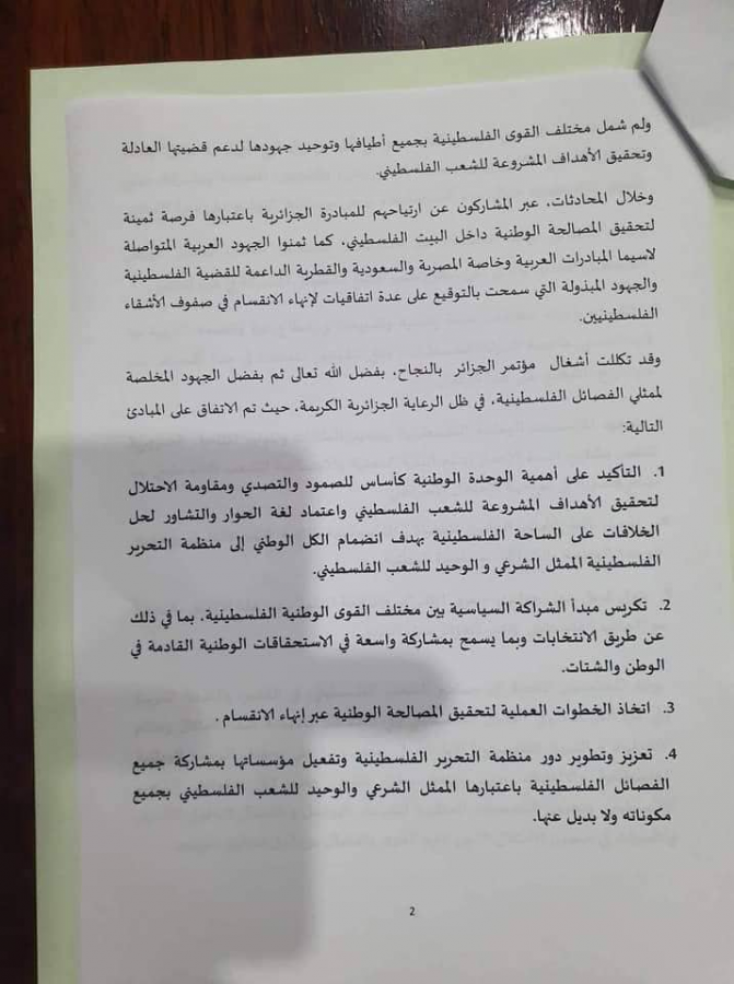 ان عدم الذكر الصريح للكفاح المسلح في البيان يدفعنا للتساؤل , هل جاء هذا التجاهل للكفاح المسلح كنوع من التساوق وارضاء لعباس الرافض للكفاح المسلح . بالمختصر , نستطيع القول ان مسودة البيان خالية من اي مضمون , ولا تشكل حلا للازمة في الساحة الفلسطينية , وكيف لها ان تشكل حلا وهي لم تتطرق للسبب الحقيقي للازمة والمتمثل باتفاق الذل والعار اوسلو وسياسة الهيمنة والتفرد , ان اي بيان او اتفاق يخلو من الاشارة الى اتفاق الذل والعار اوسلو والغاء الاتفاق ووقف التنسيق الامني وسحب الاعتراف بالكيان ..هو بيان او اتفاق غير وطني ويشكل تراجع وتساوق مع نهج التنازل والتفريط في الساحة الفلسطينية , ان نص البيان هو ترحيل للازمة والذهاب في اطار التقاسم الوظيفي تحت سقف اوسلو لا اكثر ولا اقل , وللاسف نستطيع القول ان الفصائل التى توافق على هذه المسودة , انما هي تلعب دور شاهد الزور