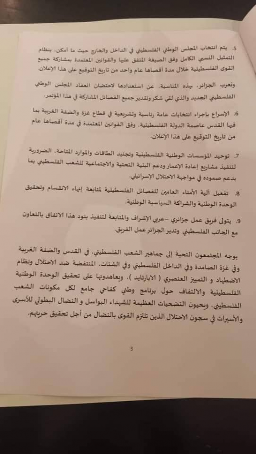 الا تدعون بوحدانية التمثيل , فباي منطق تريدون تمثيل اهلنا في الشتات وفي اراضي 48 ولا تريدون اشراكهم في المجلس الوطني!! . ونذهب الان الى البند الخامس وعبارة ( الاسراع في اجراء انتخابات عامة رئاسية وتشريعية ) يعني الهدف اعطاء الشرعية لفاقدي الشرعية وهنا ايضا نتسائل عن اي انتخابات رئاسية وتشريعية يتحدث البيان , عندما نقول رئاسية يعني رئيس فلسطين , طيب كيف يمكن ان يكون رئيسا لفلسطين ولا يشارك في انتخاب هذا الرئيس اهلنا في الشتات وفي اراضي 48 , الا اذا اختزلتم فلسطين بالضفة والقطاع فقط , اما في البند الثامن فقد وردت عبارة ( تفعيل الية العمل للامناء العامين للفصائل لتسهيل عمل الحكومة والشراكة السياسية لمتابعة الانتخابات الفلسطينية ) هذا النص ورد في المسودة الاولية للبيان , يعني حدد دور الشراكة السياسية بمتابعة الانتخابات , اليس من الافضل تعيين الامناء العامين كاعضاء في اللجنة الانتخابية , وبهذا يستطيعون متابعة الانتخابات بشكل افضل . واخيرا ناتي الى عبارة رفع العتب والتي جائت في اخر البيان كعبارة خارج البنود , واقصد هنا عبارة ( تؤكد القوى التزامها بتطوير المقاومة الشعبية وتوسيعها , وحق الشعب في المقاومة باشكالها كافة ) عبارة رفع عتب تخلو من اي اشارة واضحة وصريحة للكفاح المسلح كطريق وحيد للتحرير واقامة الدولة .