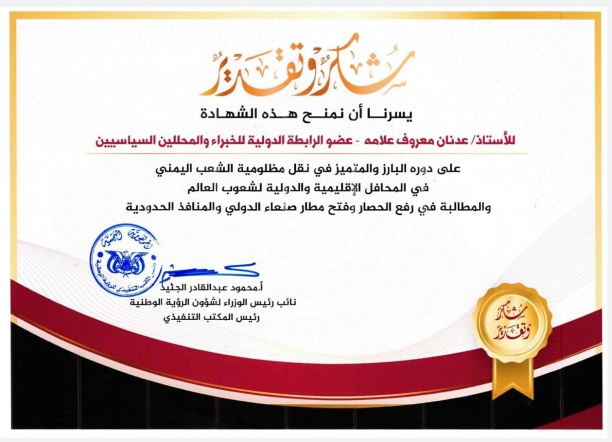 اليمن تمنح الكاتب عدنان علامه شهادة تقدير لجهوده في نقل مظلومة الشعب اليمني في المحافل الإقليمية والدولية وكما في المطالبة برفع الحصار وفتح مطار صنعاء الدولي وفتح المنافذ البحرية والبرية.