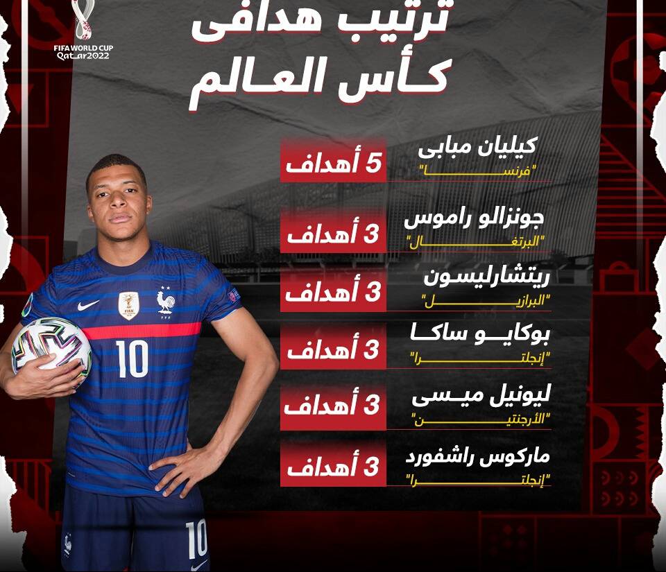 تصدر كليان مبابى مهاجم فرنسا قائمة هدافى كأس العالم 2022 برصيد 5 أهداف، متفوقا على كل من جونزالو راموس مهاجم البرتغال، وريتشالسون مهاجم البرازيل، وبوكايو ساكا لاعب إنجلترا، وليونيل ميسى مهاجم الأرجنتين، وألفارو موراتا مهاجم منتخب إسبانيا، وماركوس راشفورد مهاجم إنجلترا، وكودى جاكبو مهاجم هولندا، وإينير فالنسيا مهاجم الإكوادور أصحاب الـ3 أهداف.
