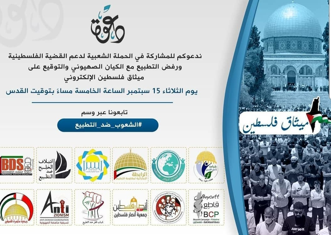 هذا وأطلق نشطاء بحرينيون دعوة للمشاركة في الحملة الوطنية، لدعم القضية الفلسطينية ورفض التطبيع والتوقيع على ميثاق فلسطين الإلكتروني