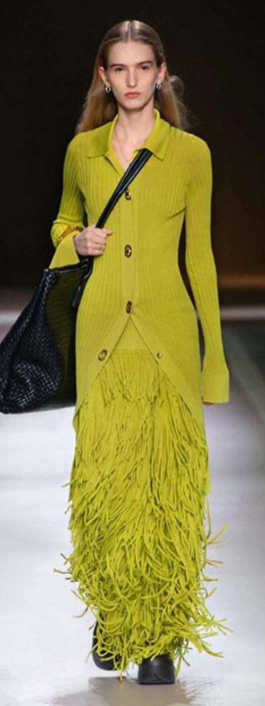 كان اللون الأخضر المصفر إضافة جديدة إلى صيحات الألوان في مدارج عروض الأزياء، حيث شوهد على بدلات التنورة المصنوعة من التويد من شانيل والفساتين الحريرية والحياكة الأنيقة، يبدو اللون نباتياً ونقياً وسيضيف بلا شك لمسة متفائلة إلى ألوان الخريف المحايدة .