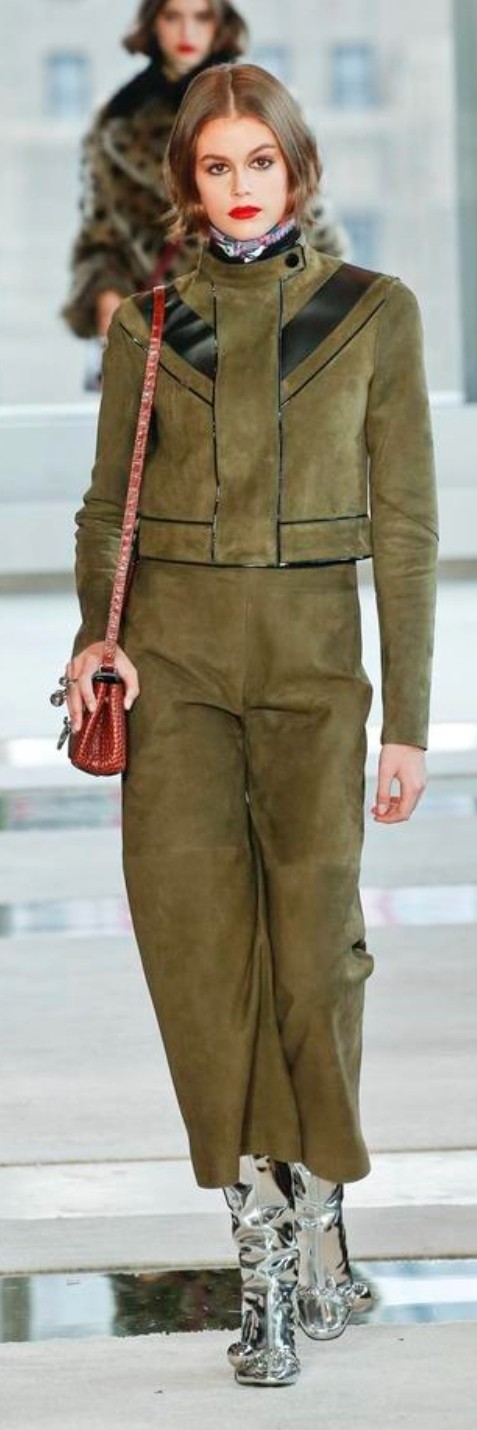 شوهدت درجات اللون الأخضر الزيتوني العميقة على مجموعة من الأقمشة من الجلد المدبوغ إلى الحرير والجلد النعام والأنسجة المبطنة، مما أضاف لمسة جريئة إلى الأزياء.