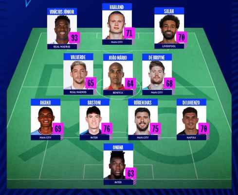 ودخل أربعة لاعبين من مانشستر سيتي في التشكيلة المثالية لدوري أبطال أوروبا، وهم البرتغالي روبن دياز والسويسري مانويل أكانجي في خط الدفاع، مع البلجيكي كيفين دي بروين في خط الوسط، خلف المهاجم النرويجي إيرلينغ هالاند، هداف البطولة برصيد 12 هدفا.