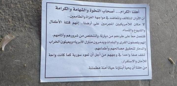 وقالت مصادر أهلية بريف دير الزور، إن “حالة الرفض الشعبي ضد الاحتلال الأمريكي وأعوانه من تنظيم قسد بدأت تأخذ شكلا جديدا، حيث عثر السكان صباح اليوم الأحد، على منشورات ورقية تدعو للانتفاض على الأمريكيين، رماها مجهولون في شوارع بلدة أبوحمام شرقي دير الزور”.