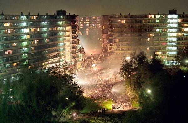 بحمولتها الكاملة من الوقود بـ 150 طنا، انغرست طائرة الشحن المنكوبة في الطابق السادس من بناية سكنية تتكون من 11 طابقا، ما تسبب في تدمير عدة أقسام على امتداد 120 مترا، ولقي طاقم طائرة الشحن الأربعة مصرعهم، كما قتل ما لا يقل عن 39 شخصا من سكان الحي.