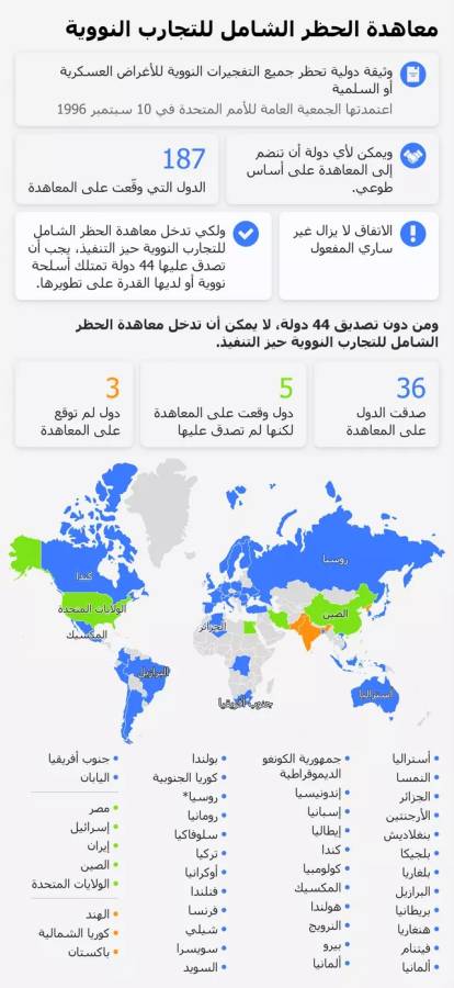 يذكر أن العالم يوجد به 9 دول نووية يعترف 5 منها بامتلاك السلاح النووي رسميا وهي روسيا والصين والولايات المتحدة الأمريكية وبريطانيا وفرنسا، إضافة إلى 4 دول لا تعترف بامتلاك السلاح النووي وهي إسرائيل والهند وباكستان وكوريا الشمالية.