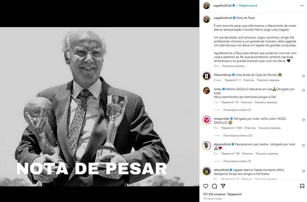 من جانبه، وصف رئيس الاتحاد البرازيلي لكرة القدم إدنالدو رودريغيز، في منشور على موقع "إنستغرام"، زاغالو بأنه أحد أعظم أساطير كرة القدم البرازيلية.