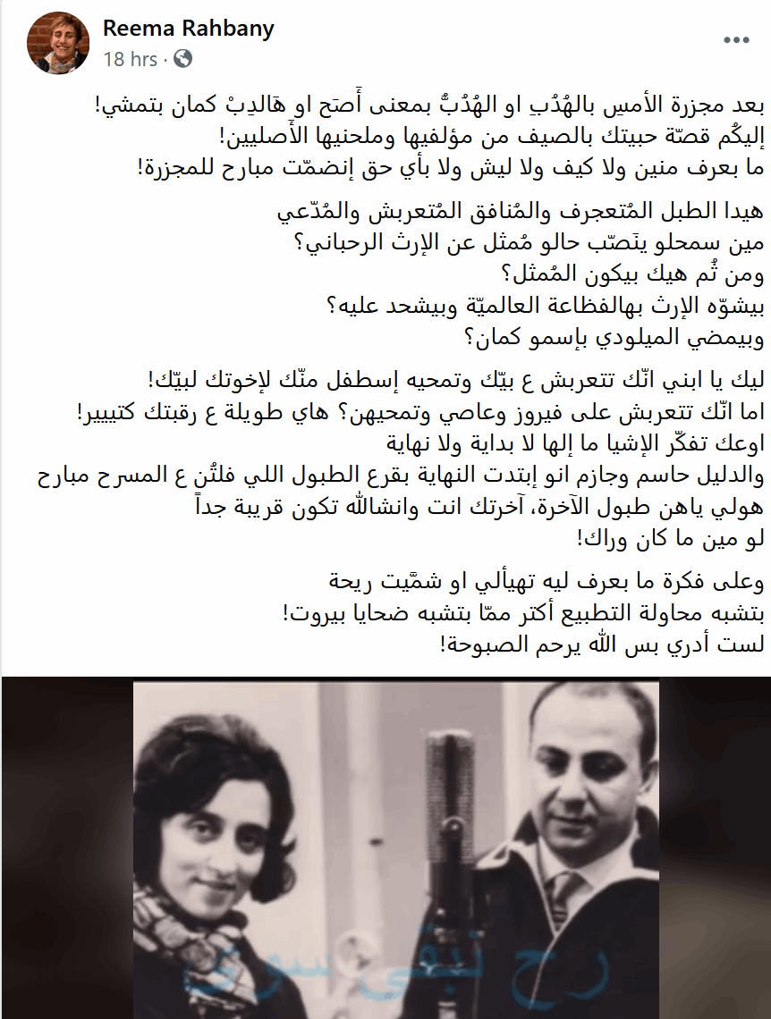 وتابعت بقولها: "هيدا الطبل المُتعجرف والمُنافق المُتعربش والمُدّعي، مين سمحلو ينَصّب حالو مُمثل عن الإرث الرحباني؟ ومن ثُم هيك بيكون المُمثل؟ بيشوّه الإرث بهالفظاعة العالميّة وبيشحد عليه؟ وبيمضي الميلودي بإسمو كمان؟".