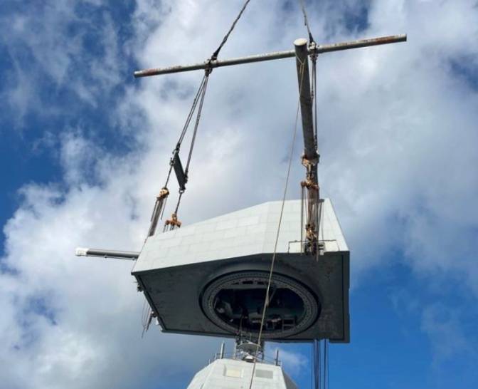 ظهرت صورة لأحد أنظمة AGS التي يبلغ طولها 155 متراً من Zumwalt على صفحة فيسبوك الرسمية الخاصة بالمدمرة، وتُظهر الصورة رافعة ترفع نظام المدافع الذي يبلغ وزنه 100 طن بعيداً عن هيكل السفينة.