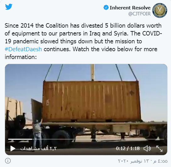 جاء ذلك في تغريدة نشرها التحالف عبر حسابه الرسمي في “تويتر”، جاء فيها إن “التحالف الدولي خصص من عام 2014 معدات بقيمة 5 مليارات دولار لشركائنا في العراق وسوريا”.