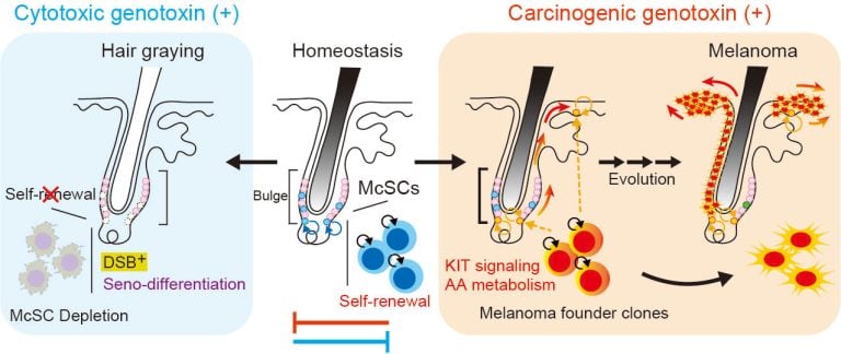 فقد كشف فريق بقيادة الأستاذة إيمي نيشي مورا ومساعدها ياسواكي موهري أن الخلايا الجذعية المسؤولة عن صبغ الشعر (McSCs) تتخذ قرارات مصيرية عند تعرضها لتلف في الحمض النووي — إما التمايز الوقائي الذي يؤدي إلى الشيب، أو التحول نحو مسار سرطاني.
