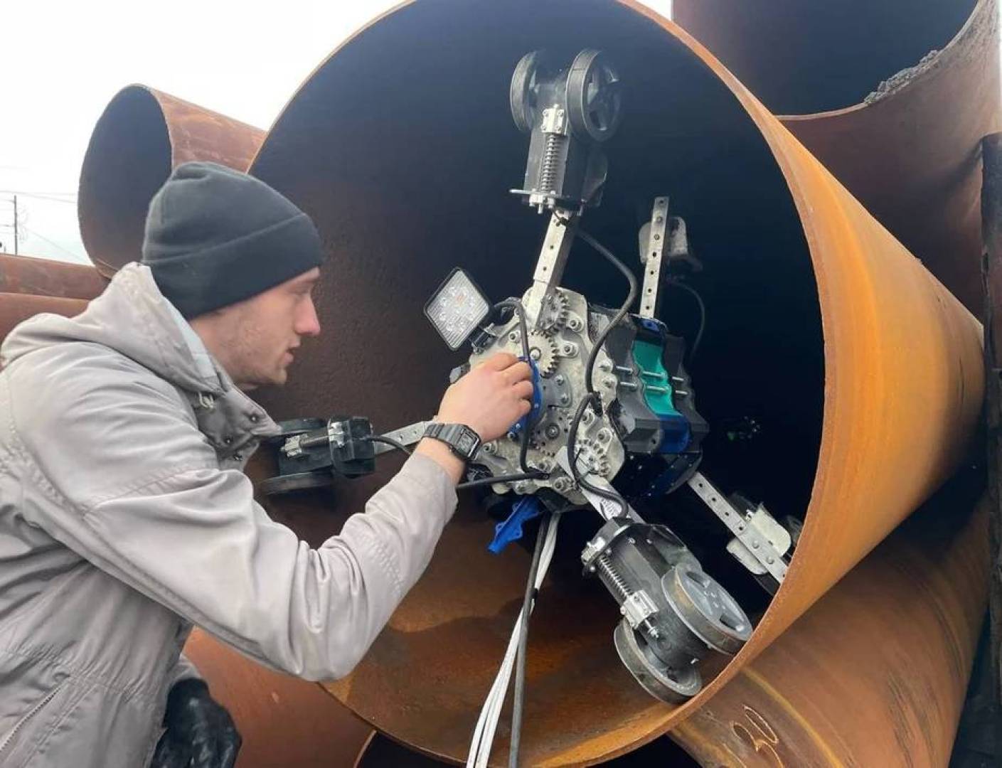 الضغط على زر التشغيل. ليبدأ الروبوت عمله داخل الأنبوب.
