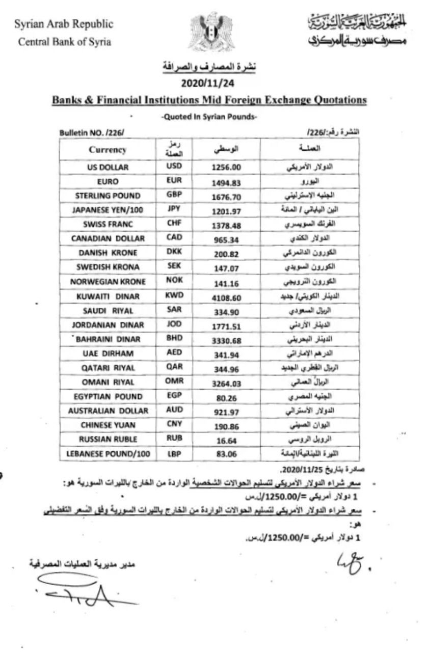 وارتفع سعر الدولار في سوريا مقابل الليرة السورية واسعار العملات في سوريا اليوم الخميس 26-11-2020 في تعاملات السوق السوداء في ظل الانهيار الاقتصادي في سوريا وعقوبات أمريكية متواصلة على الاقتصاد السوري.