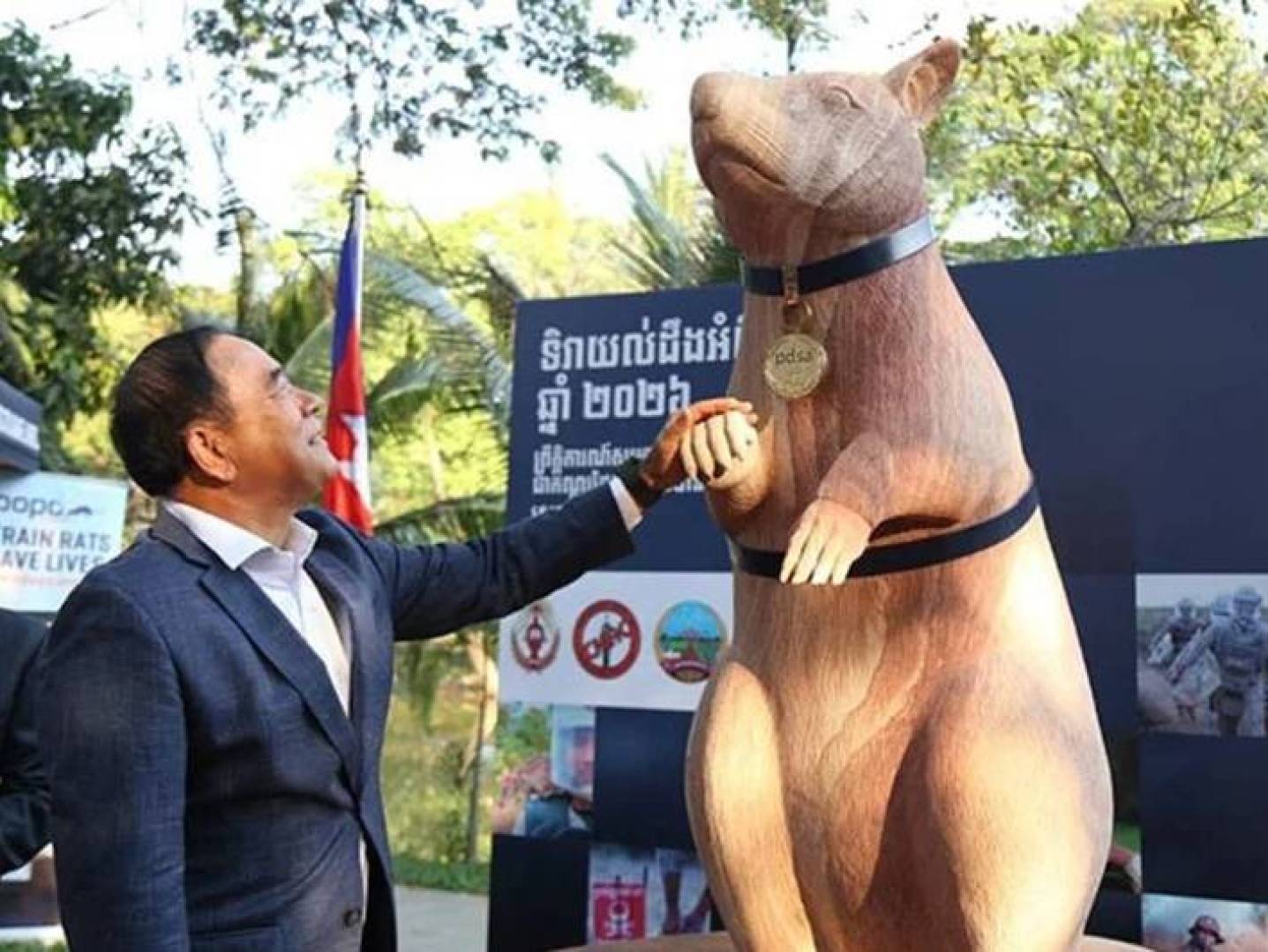 أُقيم التمثال الحجري تكريما للجرذ “ماغاوا”، وهو من فصيلة الجرذان الجرابية العملاقة، والذي شارك منذ عام 2016 في عمليات إزالة الألغام داخل كمبوديا.
