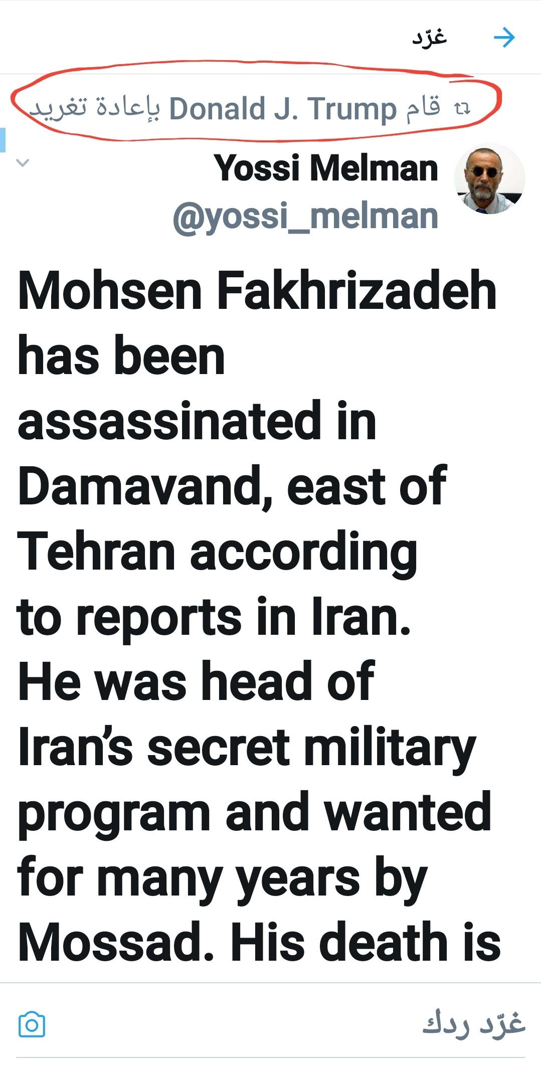 وأعاد الرئيس الأميركي دونالد ترامب، نشر تغريدة صحافي إسرائيلي حول اغتيال رئيس منظمة البحث والتطوير في وزارة الدفاع الإيرانية محسن فخري زادة.