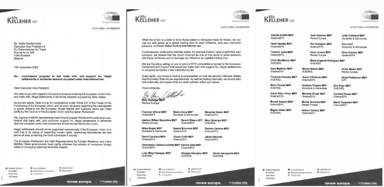 ونقلاً عن السفير المناوب في البعثة الفلسطينية لدى الاتحاد الأوروبي، عادل عطية، قوله إن الرسالة التي وقع عليها 40 عضو برلمان أوروبي رفعت إلى مفوض الاتحاد الأوروبي لشؤون التجارة، فالديس دومبروفيسكي.