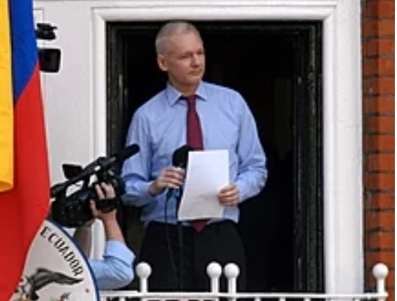 أسانج على شرفة السفارة الإكوادورية في لندن عام 2012.