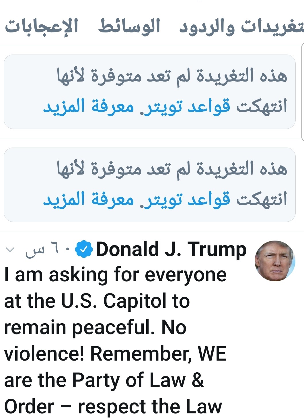 وفي وقت سابق، أعلنت منصة التدوين المصغر، تويتر ، تعليق حساب الرئيس السابق دونالد ترامب لمدة 12 ساعة، بعد حذف تغريدات له خالفت سياسة المنصة.