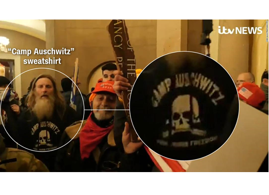 كان أحد المشاغبين داخل مبنى الكابيتول يرتدي كنزة "معسكر أوشفيتز". كُتب على الجزء السفلي من القميص "العمل يجلب الحرية"، وهي الترجمة التقريبية لكلمات "Arbeitmacht frei" التي توجد على أبواب معسكر الاعتقال النازي. كان أوشفيتز أكبر معسكرات الاعتقال النازية وأشهرها، حيث قُتل فيه حوالي 1.1 مليون شخص خلال الحرب العالمية الثانية.