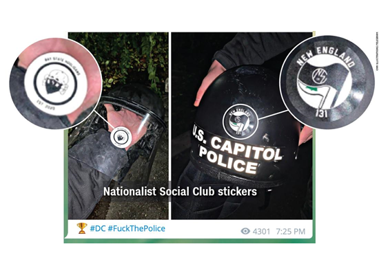 تُظهر صورة على مواقع التواصل الاجتماعي وجود ملصقات للنادي الاجتماعي المناصر للقومية على ما يبدو أنه معدات شرطة الكابيتول الأمريكية. ومن غير الواضح متى التقطت الصورة، ولكن تم نشرها يوم الأربعاء في دردشة على موقع "تلغرام" الذي تستخدمه المجموعة، التي تتضمن رمزا نازيا كجزء من أسمائها.