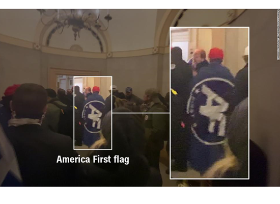 يغطي أحد مثيري الشغب جسده بعلم "أمريكا أولا" مع شعار البودكاست للمعلق اليميني المتطرف نيك فوينتيس. حضر فوينتيس الحدث أمام مبنى الكابيتول، ولكنه لم يدخل إلى المبنى.