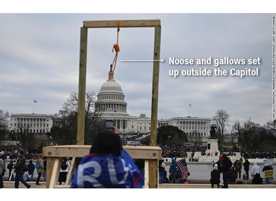 في حين أن حبل المشنقة يُستخدم غالبا كشكل من أشكال التخويف العنصري، يقول بيتكافيدج؛ إنه يعتقد في هذا السياق أن المشنقة تعبر على العقوبة لارتكاب الخيانة. ويوضح قائلا؛ "إنه يشير إلى أن النواب وأعضاء مجلس الشيوخ الذين يصوتون للتصديق على نتائج الانتخابات، وربما نائب الرئيس بنس، يرتكبون الخيانة ويجب محاكمتهم وشنقهم". وقد شوهد خطاب الخيانة هذا على لوحات الرسائل اليمينية في الأيام التي سبقت الحدث.