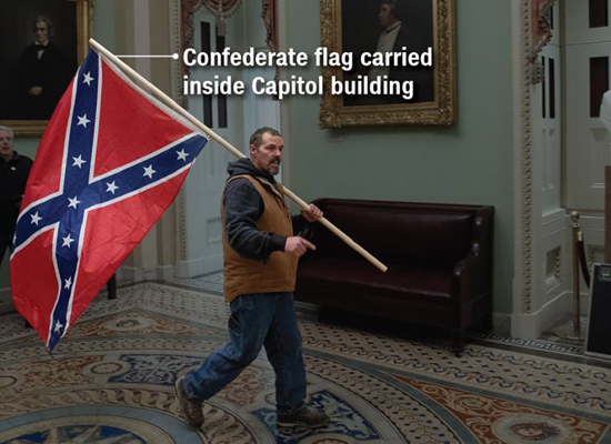 خلال الحرب الأهلية الطويلة، لم يظهر علم الكونفدرالية على مقربة من مبنى الكابيتول الأمريكي، ولكن يوم الأربعاء، حمل أحد المشاغبين علم الكونفدرالية متجولا به في أرجاء الكابيتول.