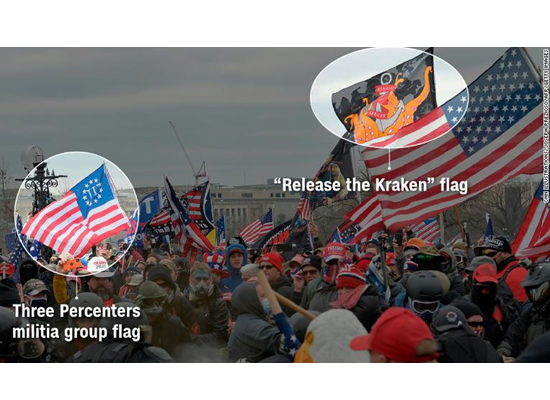 وفي هذا الصدد، قال مارك بيتكافيدج، المؤرخ والخبير في التطرف في رابطة مكافحة التشهير: "كان هذا حدثا مصمما لمعارضة نتائج انتخابات ديمقراطية حرة ونزيهة وانتقال السلطة، الذي سيتبع ذلك بشكل طبيعي". وتحدثت معه شبكة سي إن إن للتعرف على الرموز وفهم الرسائل المروعة للطغيان، وتفوق البيض والفوضى والعنصرية ومعاداة السامية والكراهية التي تجسدها هذه المجموعات.