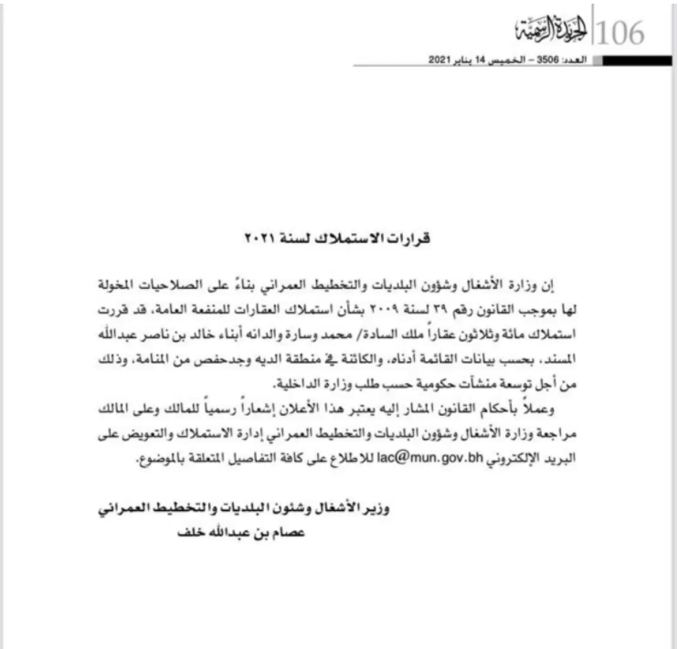وأوضح أن إعلان القرار بالجريدة الرسمية يعد إشعارا رسميا للملاك لمراجعة إدارة الاستملاك والتعويض في الوزارة البحرينية.
