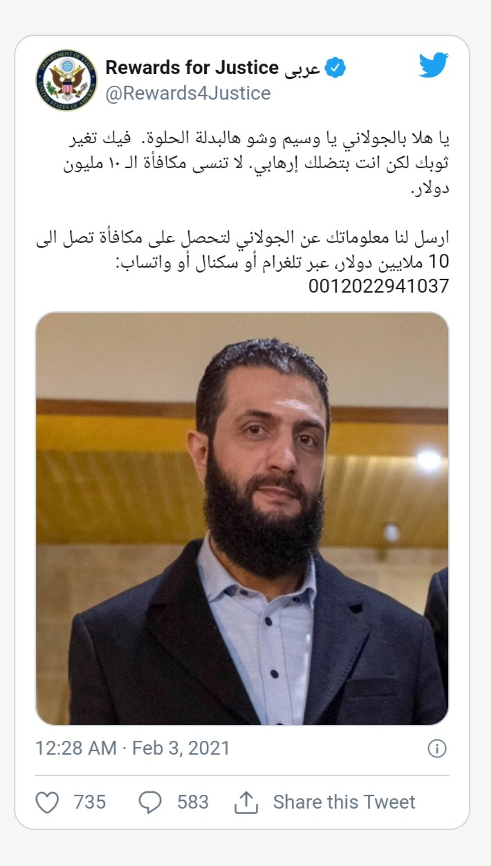 نشر حساب يتبع لوزارة الخارجية الأمريكية على "تويتر"، صورة لزعيم هيئة تحرير الشام (النصرة سابقا) أبي محمد الجولاني، مرتديا بدلة.