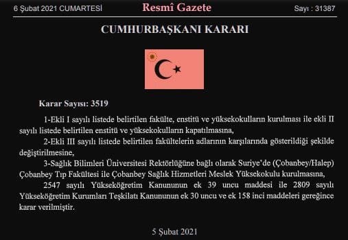 وجاء في القرار أنه سيتم افتتاح كلية طب ومعهد عال للعلوم الصحية في بلدة جوبان باي، وأنهما سيتبعان لجامعة العلوم الصحية التركية بإسطنبول.
