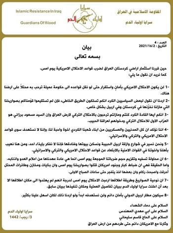 ذكر بيان "لسرايا أولياء الدم" التي تبنت الهجوم على قاعدة حرير في أربيل إن الاحتلال الأميركي "لن يكون بأمان".