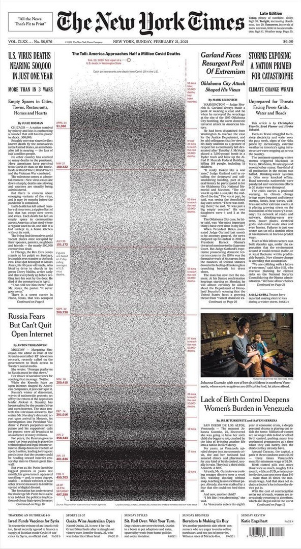 وقامت الصحيفة الأمريكية الشهيرة بوضع 500 ألف نقطة باللون الأسود على صفحتها الأولى، وهو نفس عدد الوفيات في الولايات المتحدة الأمريكية جراء الوباء.