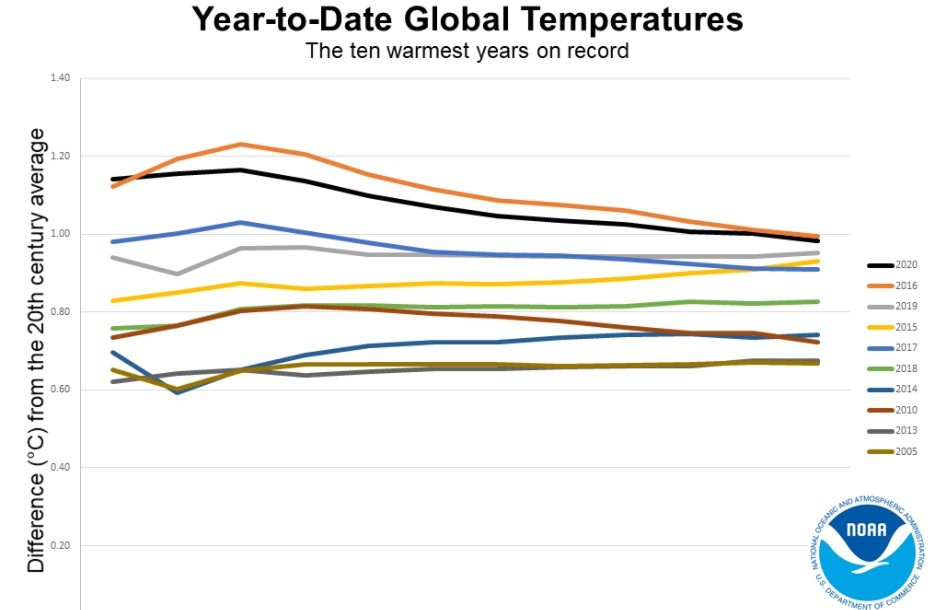 تبين للعلماء في دراسة المناخ ان السنوات ال20 الاخيرة كانت درجات الحرارة في تصاعد غير طبيعي وكان عام 2016 هو الاكثر حرارة في التاريخ يليه عام 2020 ثم عام 2019 وتمت مقارنة القراءات بين العديد من الدول والمؤسسات للتثبت من الارقام وقد تم التثبت فعلا كما هو موضح في الصورة فاللون البرتقالي 2016والاسود 2020