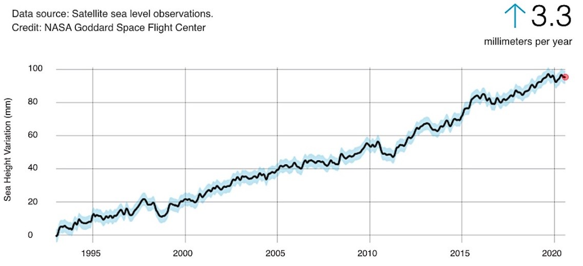 المحيطات أيضا ارتفع منسوبها نتيجة الحرارة فالماء يكبر حجمة مع الحرارة وهذه البياني من ناسا يوضح ذلك