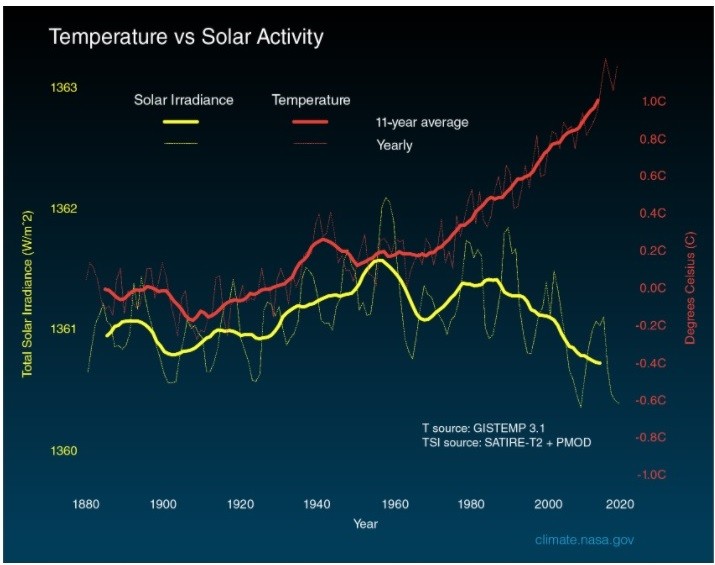 ما قد يعتقده الكثيرين ان النشاط الشمسي ربما كان السبب الطبيعي الاكبر بالاحترار العالمي ولكن القياسات الدولية تظهر ان النشاط الشمسي قد تضاءل منذ عام 1980 كما هو موضح في الصورة فاللون الاصفر يظهر النشاط الشمسي بانخفاض بينما الحرارة باللون الاحمر في تصاعد