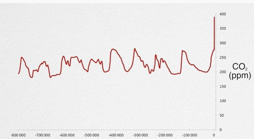 منذ عام 1953 بدأ العلماء بقياس تزايد نسبة ثاني اكسيد الكربون CO2 في مختبرات هاواي وأظهرت القياسات ان الزيادة السنويه منذ ذلك التاريخ بمقدار 2 جزء بالمليون والان اصبح مقدار CO2 يفوق 420 جزء بالمليون وهي قراءة تاريخيه لان العلماء يعلمون مقدار CO2 ل 800 الف سنة مضت من خلال تحليل اسطوانات الجليد التي تحفر بالقطبين الشمالي والجنوبي وقد تبين خلال كل ذلك التاريخ لم يتجاوز مقداره ال 280 جزء بالمليون طوال تاريخ الكرة الارضية كما موضح في الصورة ناهيك ان ما هو موجود الان هو النظير الكربوني 12 الذي يطلقه احتراق الوقود الاحفوري