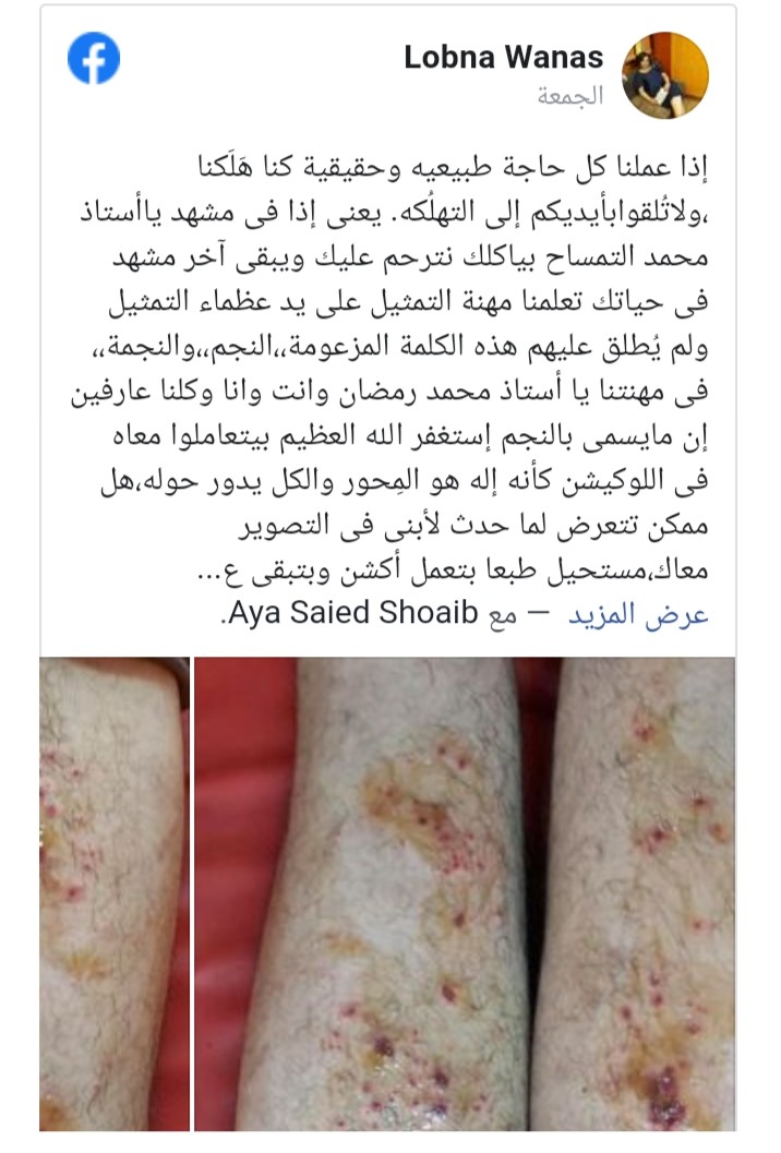 ونشرت لبنى ونس صوراً عبر حسابها على “فيسبوك”، تكشف خلالها الحروق التي تعرض لها ابنها، وعلقت: “إذا عملنا. كل حاجة طبيعية وحقيقية كنا هَلَكنا ولاتُلقوا بأيديكم إلى التهلُكة، يعنى إذا فى مشهد يا أستاذ محمد التمساح بياكلك نترحم عليك ويبقى آخر مشهد في حياتك”.